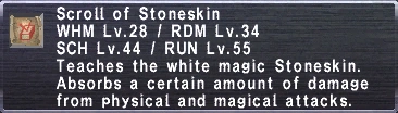 Note: You must be from the corresponding vendor locations to be able to buy this spell from them and your nation must be in first place in the conquest ranking. e.g. Kususu will only sell Stoneskin to a Windurst resident, and only if Windurst currently ranks 1st in Conquest.